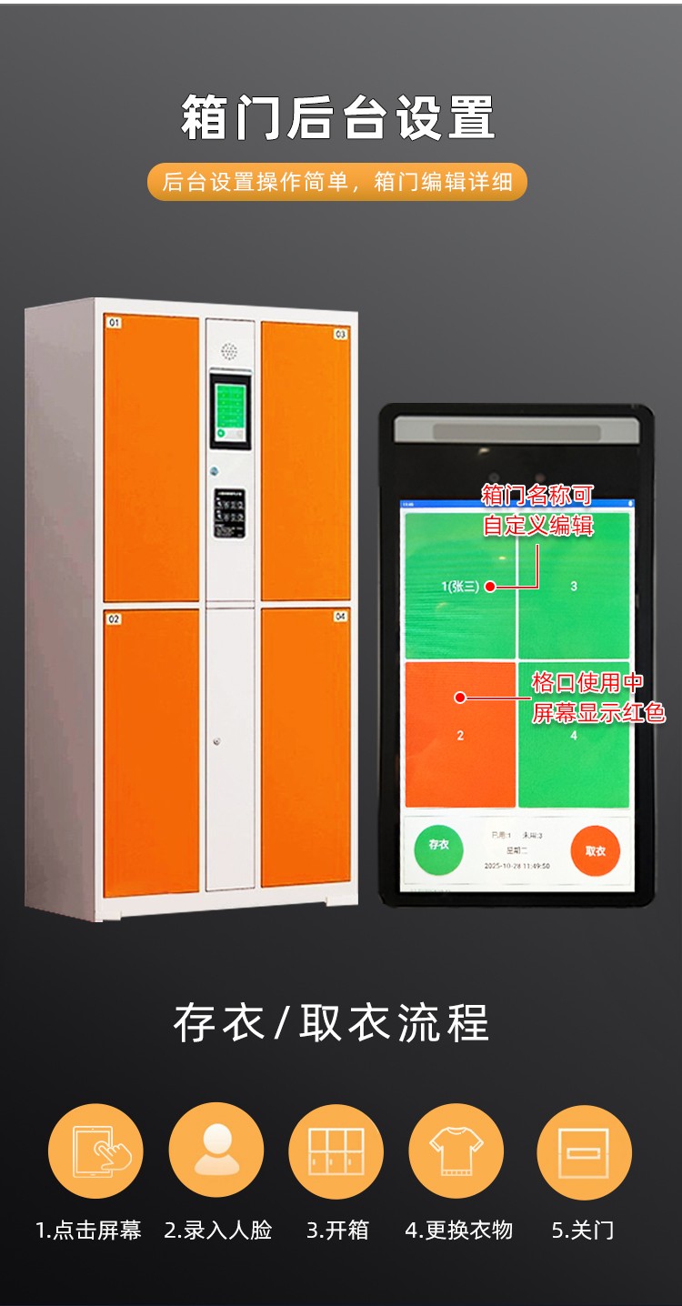 人脸识别衣柜可通过刷脸进行物品存取,通常支持专人专用(固定人员)和随机分配(流动人员)两种管理模式。